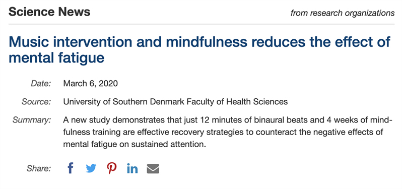 University of Southern Denmark Faculty of Health Sciences. (2020, March 6). Music intervention and mindfulness reduces the effect of mental fatigue. ScienceDaily. Retrieved July 16, 2020 from www.sciencedaily.com/releases/2020/03/200306122509.htm