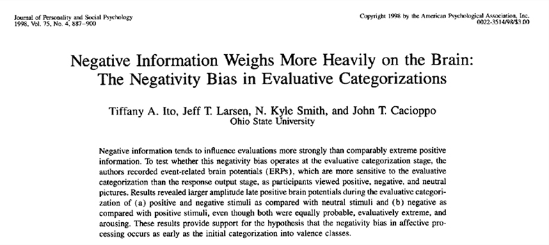 Ito, Tiffany & Larsen, Jeff & Smith, Kyle & Cacioppo, John. (1998). Negative Information Weighs More Heavily on the Brain. Journal of personality and social psychology. 75. 887-900. 10.1037/0022-3514.75.4.887. Retrieved from https://www.researchgate.net/publication/13460251_Negative_Information_Weighs_More_Heavily_on_the_Brain