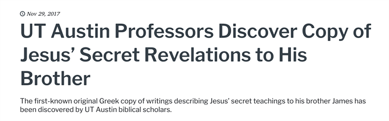 UT News. (2017, November 29). UT Austin Professors Discover Copy of Jesus’ Secret Revelations to His Brother. Retrieved from https://news.utexas.edu/2017/11/29/ut-austin-professors-discover-copy-of-jesus-secret-teaching/